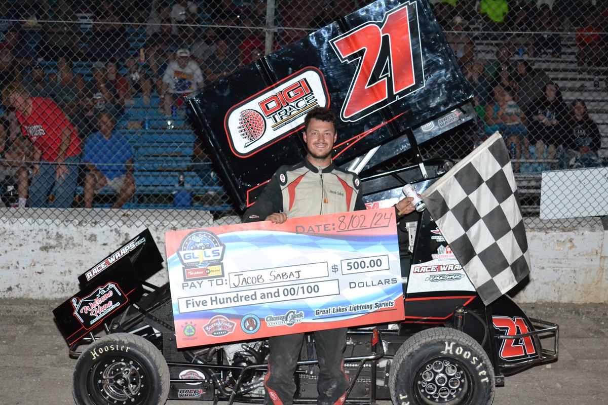 Aubrun , MI - Cournna, MI native Jacob Sabaj wins his sixth Feature Race of the 2024 season with the Great Lakes Lightning Sprints presented by MacAllister CAT The Rental Store Friday night at Tri-City Motor Speedway.